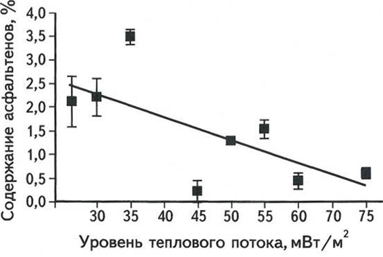 Рис. 4. ИЗМЕНЕНИЕ СОДЕРЖАНИЯ АСФАЛЬТЕНОВ В НЕФТЯХ В ЗАВИСИМОСТИ ОТ УРОВНЯ ТЕПЛОВОГО ПОТОКА