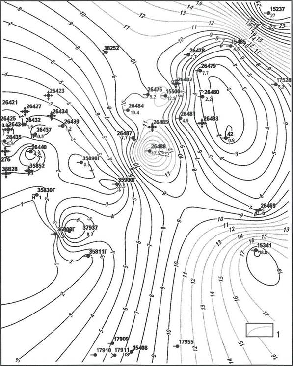1 - изолинии с невысокой раскрытостью трещин, см*10 2