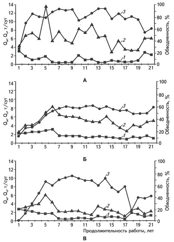 Раскрытость трещин, см: А -> 0,150; Б-0,011-0,150; В-< 0,010; дебит, т/сут: 1 - нефти, 2 - жидкости; 3- обводненность, %