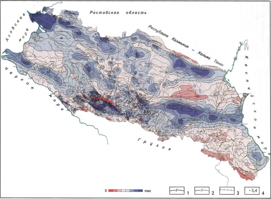 В ряде случаев устанавливаются значимые корреляционные связи между скоплениями УВ и аномальными значениями силы тяжести. Так, северная граница Русской плиты (в сочленении с Ростовско-Сальской зоной) вдоль Восточно-Манычского глубинного шва сопровождается скоплениями УВ. Нефтегазоносные структуры передовых прогибов (Ахтырская по южному борту Западно-Кубанского прогиба и Терско-Сунженская вдоль оси Терско-Каспийского прогиба) также расположены в пределах шовной зоны - сочленения юга Скифской плиты и Большого Кавказа.