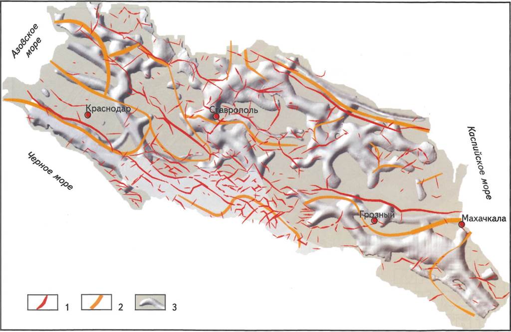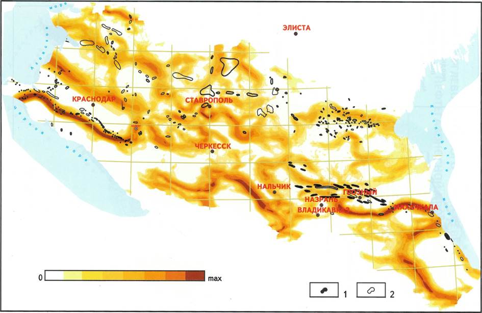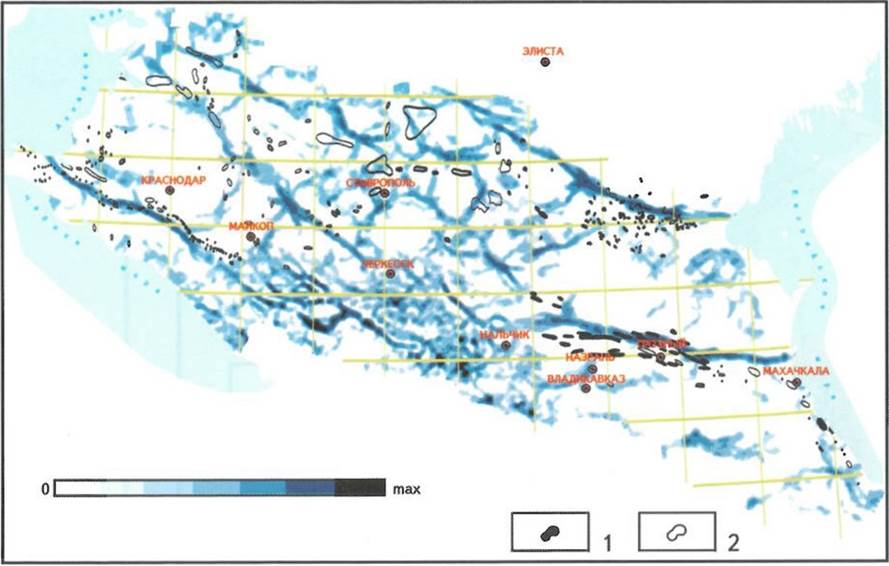 Устанавливается связь между концентрациями УВ-сырья с шовными зонами (границами литосферных плит). Вдоль шовной зоны по югу Русской плиты прослеживаются скопления газоконденсатных залежей (Каневско-Березанский вал) и газовых месторождений (Северо-Ставропольское поднятие). Восточнее, в зоне сочленения кряжа Карпинского и Скифской плиты, фиксируются нефтяные залежи Прикумского вала. На юге шовная зона разграничивает Скифскую плиту и мегантиклинорий Большого Кавказа. К ней примыкают зоны прибортовой складчатости Западно-Кубанского и Терско-Каспийского прогибов. Несомненно, в распределении промышленных скоплении нефти и газа важную роль играют глубинные разломы субширотного простирания. Они формируют узкие, вытянутые в западно-северо-западном направлении локальные структуры, с которыми связаны высокопродуктивные коллекторы различного типа, обеспечивающие максимальные скопления УВ-сырья. В качестве примера можно привести осевую часть Западно-Кубанского прогиба, представленную Анастасиевско-Краснодарской антиклинальной зоной, в которой отмечены надвиговые явления, сопровождаемые интенсивными дизъюнктивными дислокациями. Аналогичная структурная позиция может быть отмечена и для Терско-Сунженской антиклинальной зоны.