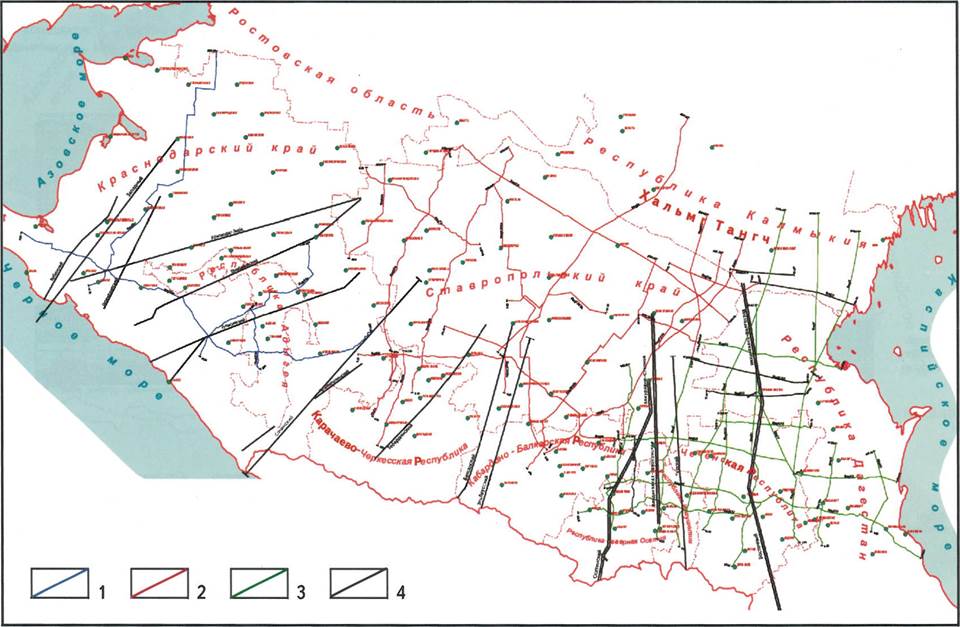 Сейсмопрофили: 1 - ПО “Краснодарнефтегеофизика”; 2 - ПО “Ставропольнефтегеофизика”, 3- ПО “Грознефтегеофизика”; 4- ГСЗ