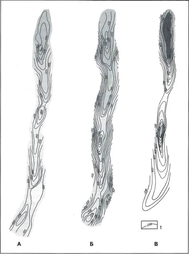 В поверхности верейского горизонта прогиб сохраняет очертания, но еще более снивелирован, амплитуда погружения в среднем составляет 20 м, в отдельных локализованных зонах имеет глубину до 30 м (см. рис. 3, Б). Общий наклон в северном направлении сохраняется, границы прогиба еще более нечетки.