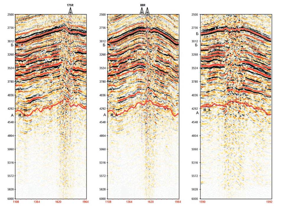 2. Верхнепалеозойская (пермско-триасовая) часть разреза, имеющая сложное внутреннее строение со следами шовной складчатости герцинского тектогенеза и глубокого предъюрского размыва на теле позднедокембрий-раннепалеозойского основания, без данных бурения не может быть охарактеризована при текущем качестве сейсмических данных.