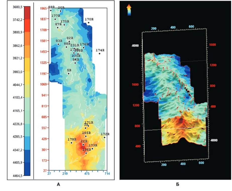 Рис. 2. Структурная модель кровли доюрского фундамента (горизонт А) Еты-Пуровского вала: А - структурная карта, Б - куб структурной поверхности (аксонометрия)