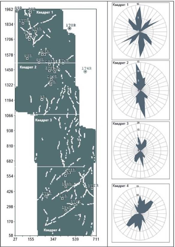 Рис. 3. Фрагменты следов разломов, картируемых на уровне кровли фундамента (горизонт А), и розы-диаграммы простирания разломов фундамента по элементарным квадратам объединенного куба Еты-Пуровского вала