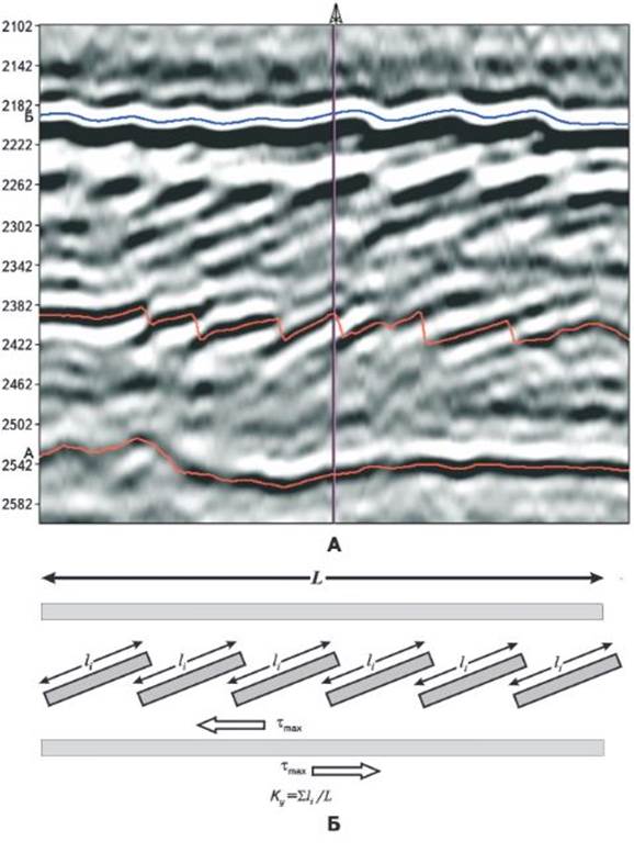 Рис. 4. Пример черепичного залегания разорванных пластов юрской толщи (структура домино ) (А) и модельное представление горизонтального сокращения пространства вследствие внутрислойного сдвига в горизонтальной плоскости (Б), Западно-Комсомольская площадь