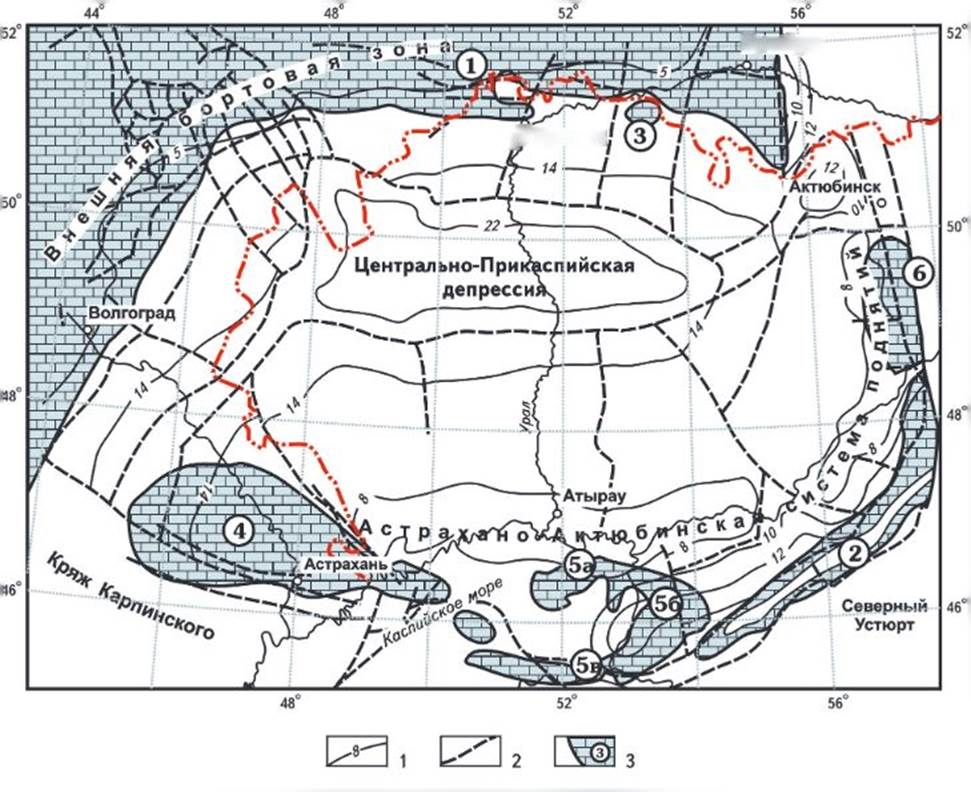 1 - изогипсы поверхности фундамента, км; 2- основные разломы; 3- карбонатные платформы; карбонатный шельф: 1 - северо-западного обрамления Прикаспийской впадины, 2- Южно-Эмбинско-Жанажольской зоны; изолированные внутрибассейновые карбонатные платформы: 3- Карачаганакская, 4- Астраханская, 5- Каратон-Тенгизская, 5а- Кашаган-Кайранский участок, 5б- Каратон-Тенгизский участок, 5в- Южный участок, 6- Темирская