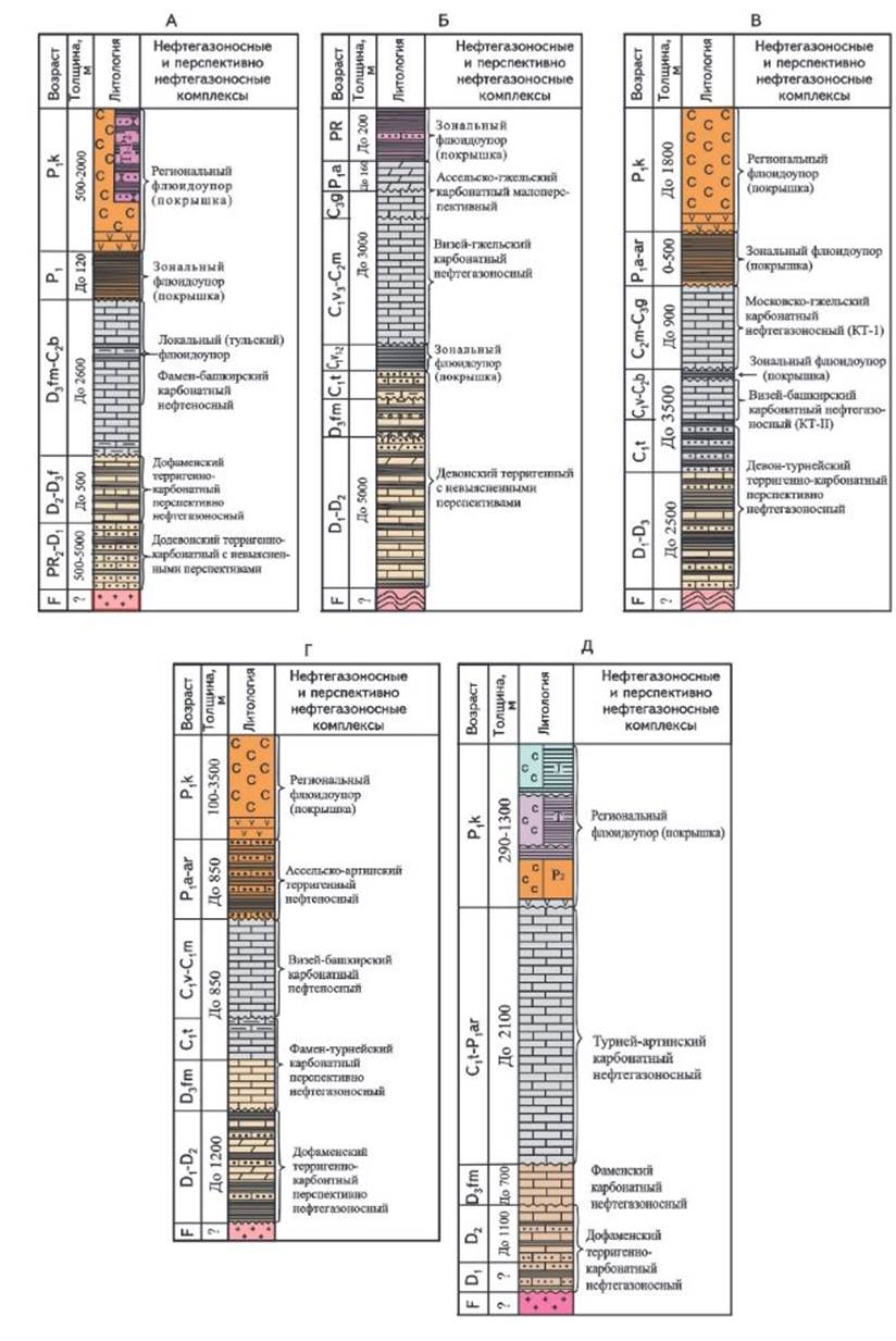 А - тенгизский; 5- южно-эмбинский; В - жанажольский; Г- темирский; Д - карачаганакский