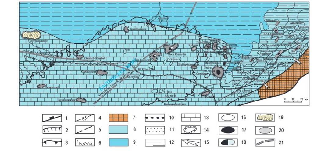 В пределах карбонатной палеозойской платформы выделяются зоны поднятий: на западе - Астраханско-Имашевская, на востоке - Жылыойская (Кашаган-Тенгизская). На юге эти зоны поднятий сопряжены с Каракульско-Смушковской зоной дислокаций, крупным поднятием Курмангазы и Култукским валом. Кашаган-Тенгизская зона палеозойских поднятий далеко протягивается в море и объединяет Каратон-Тенгизскую группу поднятий и Кашаганский вал в единое крупное Жылыойское поднятие [5]. К Астраханско-Имашевской группе относится также крупное Южно-Жамбайское палеозойское поднятие, расположенное в прибрежной зоне. Все перечисленные структурно-тектонические элементы карбонатной платформы приурочены к отдельным блокам фундамента, которые в позднепалеозойское время на фоне господствующего погружения развивались как положительные структуры. В предпермское время своды крупных поднятий были срезаны эрозией. Интенсивные инверсионные движения на границе карбона и перми благоприятствовали формированию здесь крупных высокоамплитудных ловушек, позже перекрытых региональной соленосной толщей кунгура.