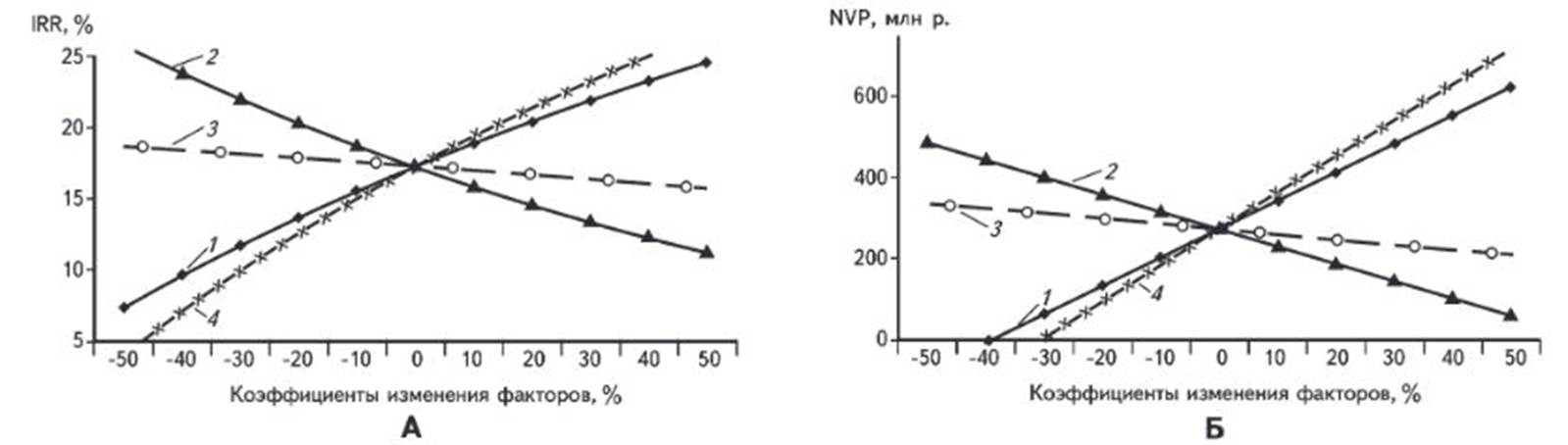 Рисунок ЧУВСТВИТЕЛЬНОСТЬ ВНУТРЕННЕЙ НОРМЫ РЕНТАБЕЛЬНОСТИ (А) И ПОТОКА НАЛИЧНОСТИ (Б) К ИЗМЕНЕНИЮ ОСНОВНЫХ ФАКТОРОВ ПО РЕКОМЕНДУЕМОМУ ВАРИАНТУ РАЗВИТИЯ ГЕОЛОГО-РАЗВЕДОЧНЫХ РАБОТ И РАЗРАБОТКИ ВОЛГО-УРАЛЬСКОЙ НГП