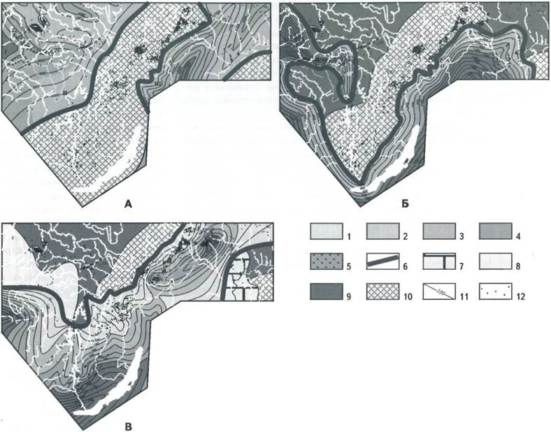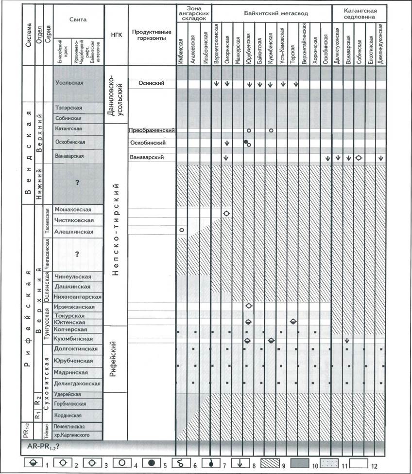 Залежь: 1 - нефтегазовая, 2- газовая, 3- газоконденсатная; промышленный приток: 4- газа, 5-нефти; приток: 6-газа, 7- нефти, 8- воды; 9- отсутствие отложений; 10 - фундамент; 11- рифейский нефтегазоносный подкомплекс; 12- продуктивные горизонты