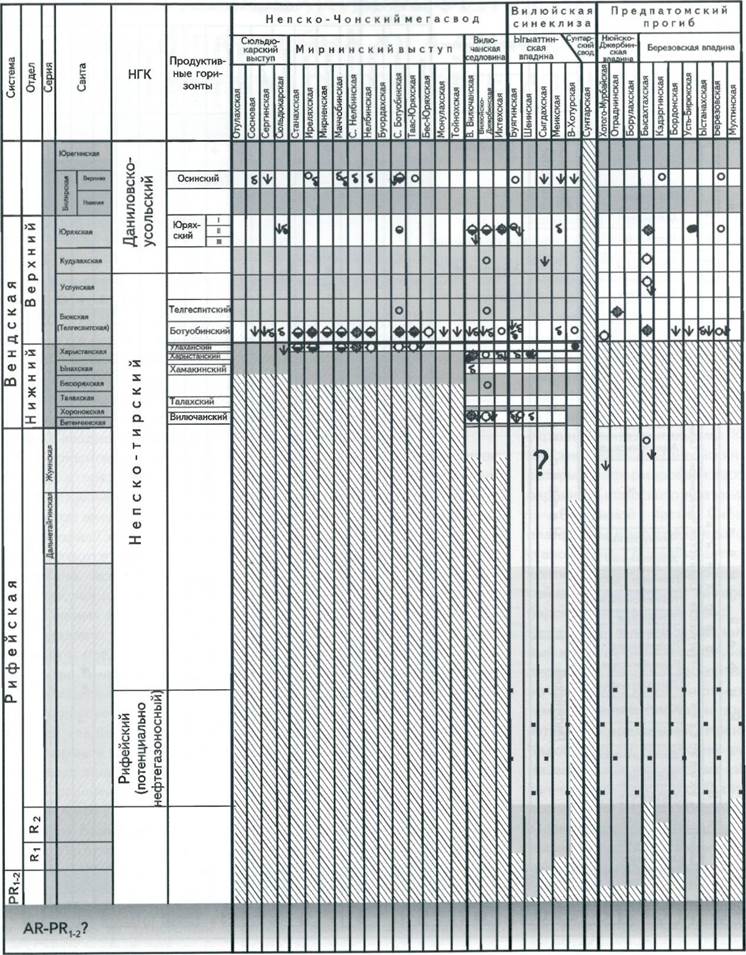 Промышленные притоки УВ из отложений позднего рифея, кроме установленных в пределах Байкитской антеклизы, были получены в поисково-разведочных скважинах на склонах Алданской антеклизы и в Березовской впадине. Скопления УВ и промышленные притоки в разных структурных зонах платформы приурочены к различным стратиграфическим уровням позднего рифея. В пределах Байкитской антеклизы залежи УВ отмечены в отложениях добайкальского рифея, в пределах Иркинеево-Чадобецкого и Березовского авлакогенов притоки газа получены из отложений байкалия. Стратиграфическая привязка притоков нефти из отложений рифея на склонах Алданской антеклизы остается весьма проблематичной.