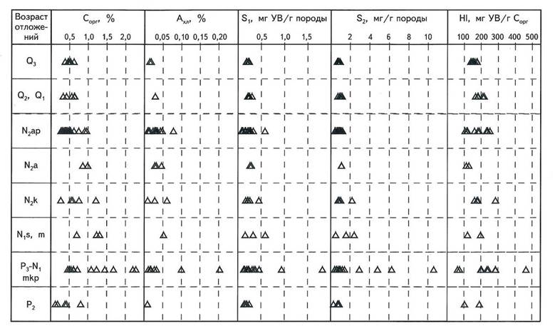 Глинистые образования эоцена, неогена и четвертичные, в отличие от майкопских, характеризуются низкими содержаниями Сорг и Ахл и невысокими значениями S1 и S2.