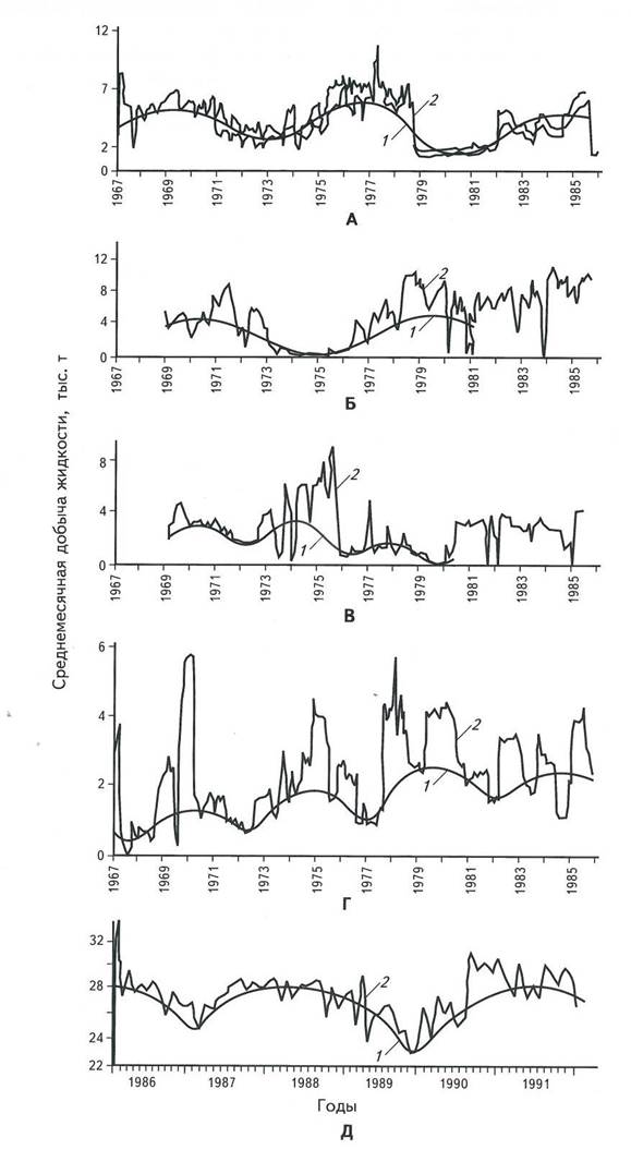 Рис. 1. ДИНАМИКА СРЕДНЕМЕСЯЧНОЙ ДОБЫЧИ НЕФТИ ПО МЕСТОРОЖДЕНИЯМ: УСТЬ-БАЛЫКСКОЕ, ЗАПАДНАЯ СИБИРЬ (А-Г), ОКТЯБРЬСКОЕ, ТЕРСКО СУНЖЕНСКАЯ ЗОНА (Д) (по Касьяновой Н.А., 2004)