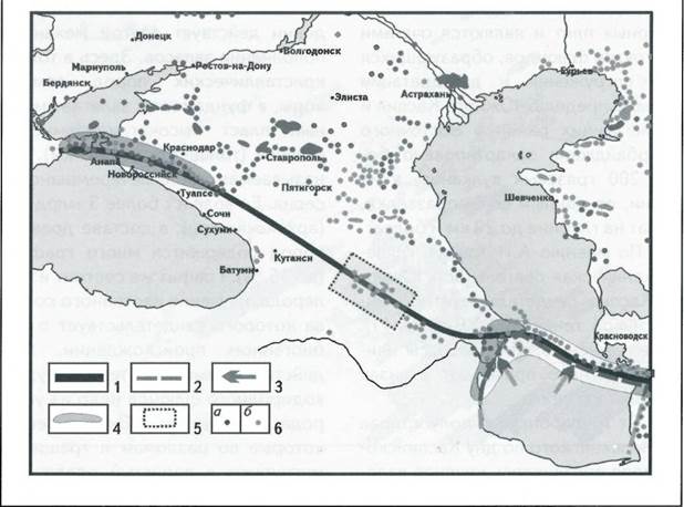 1 - Крымско-Кавказская сутура; 2 - границы Южно-Каспийской плиты; 3 - направление движения плиты; 4 - области грязевого вулканизма; 5 - границы Терско-Сунженского района; 6 - месторождения: а - нефти, б - газа