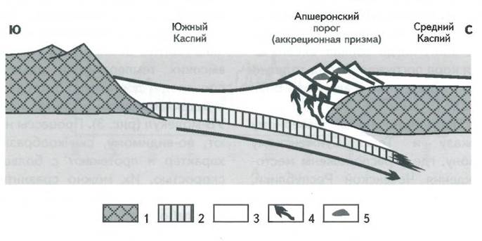 От Апшеронского полуострова до Челекенского по дну Каспийского моря протянулось крупное валообразное поднятие - так называемый Апшеронский порог. К нему-то и приурочено большинство знаменитых месторождений нефти Южного Каспия (см. рис. 2). По нашей модели, это не что иное, как аккреционная призма, т.е. комплекс осадочных пород, которые не “проскочили” в зону субдукции, а оказались “содраны” и собраны в своеобразную кучу. В ее пределах и создались благоприятные условия для накопления блуждающих УВ-флюидов в залежи.