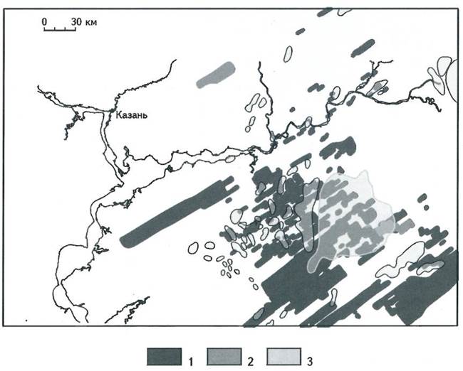 1 - отложения большечеремшанской серии; 2 - верхнеархей-нижнепротерозойские высокоглиноземистые образования; 3 - месторождения нефти