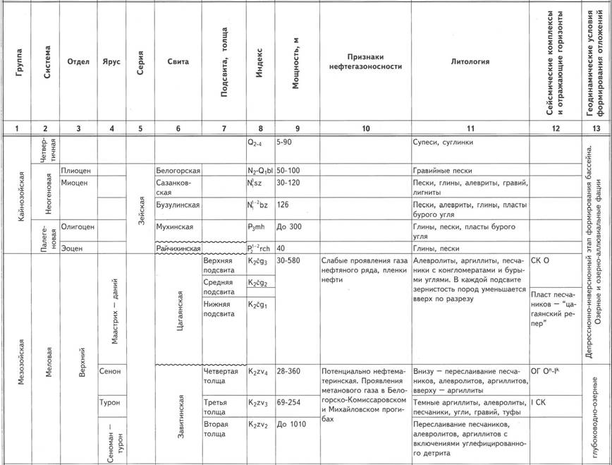 Цагаянская свита (Маастрихт - даний) покрывает всю Зея-Буреинскую впадину горизонтально залегающим плащом, который перекрывает размытую поверхность завитинской и поярковской свит, иногда кристаллический фундамент. Максимальную мощность достигает в центральной части бассейна (до 580 м). Имеет цикличное строение - разделяется на три подсвиты, отражающие отдельные седиментационные циклы. В каждой подсвите зернистость пород уменьшается вверх по разрезу от грубозернистых песчаников до глин. Сложена алевролитами, аргиллитами, песчаниками с конгломератами и бурыми углями. Отдельные пласты черных аргиллитов имеют мощность 3-48 м. Кровля определяется сейсмофациальным комплексом О. В нижнецагаянской подсвите пласт мелкозернистых песчаников - “цагаянский репер”. В верхней части верхнецагаянской подсвиты в юго-восточной части бассейна выделяются характерные кивдинские слои, ранее выделявшиеся в ранге свиты, содержащие мощные пласты бурого угля.
