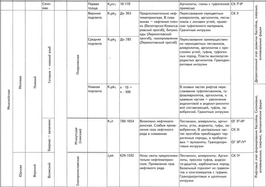 Меловая система. Нижний отдел. Итикутская (томская) свита (берриас - валанжин) имеет эффузивно-пирокластический состав. В крупных прогибах наблюдается заметная литолого-фациальная изменчивость, выражающаяся в преобладании в центральных частях прогибов терригенных пород, а в прибортовых частях - вулканитов. В осевых частях грабенов эти отложения состоят из песчаников, алевролитов, аргиллитов, углей, андезитов. К краевым частям грабенов происходит увеличение андезитовой и андезит-риолитовой составляющей, появляются прослои туфов и лавобрекчий. Мощность андезитов до 233 м, мощность пластов аргиллитов до 19 м. Общая мощность свиты в Лермонтовском прогибе 876 м, Михайловском - 780 м, Белогорско-Комиссаровском - 788 м, на горно-складчатом обрамлении бассейна до 1054 м.