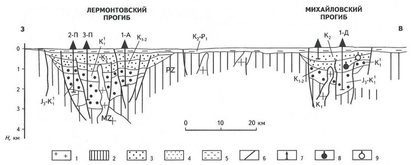 В тектоническом отношении бассейн представляет собой систему рифтогенных грабенов северо-восточного простирания длиной 140-200 км и шириной 15-80 км - Лермонтовский, Белогорско-Комиссаровский, Сычевско-Спасовский, Михайловский, Екатеринославский и Архаринский. Они разделены приподнятыми зонами - Благовещенской, Полтавско-Поздневской и Райчихинской (рис. 1, 2). Мощность осадочных отложений в рифтогенных прогибах колеблется от 500 м в прибортовых зонах до 3500 м и более в центральных частях и уменьшается с востока на запад: 3000 м и более в западной зоне бассейна (Лермонтовский, Белогорско-Комиссаровский), до 2500 м в центральной (Екатеринославский, Михайловский, Поярковский) и около 1000-1500 м в восточной (Архаринский). На разделяющих прогибы поднятиях мощность чехла не превышает 500 м.