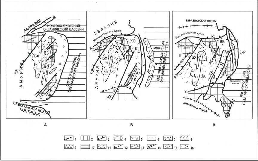 А - поздняя кора, Б- ранний мел, В - настоящее время; 1 - границы плит; 2-Сино-Корейская платформа; 3-сутуры (индекс - возраст образования); 4 - массивы; 5 - вулканические пояса (индекс - возраст вулканизма); 6 - надрифтовые впадины; 7- впадины трансформированных пассивных окраин; 8 - Зея-Селемджинская коллизионная зона; 9-пассивная окраина; 10- океанические бассейны; 11 - Сихотэ-Алинский аккреционный массив; 12-зоны субдукции; 13-Внутреннемонгольская надвиговая зона; 14- сдвиги; 15- рифт; 16 - направление движения плит; вулканические пояса: БХ - Большехинганский, СА - Сихотэ-Алинский, ХО - Хингано-Охотский, Ад - Алчанский, Ар - Арсеньевский, УО - Умлекано-Огоджинский; впадины: ЗБ - Зея-Буреинская, С - Сунляо, ВБ - Верхне-Буреинская. СрА - Средне-Амурская, Су - Сунгарийская; сдвиги: ТЛ - Танлу, АС - Амуро-Селемджинский, КТ - Корейско-Тайванский