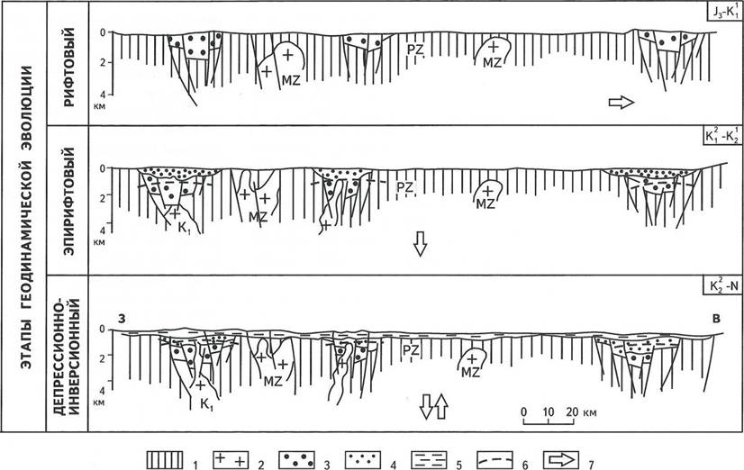 Начиная примерно с баррема и вплоть до конца позднего мела осадконакопление распространяется за пределы рифтов, приобретая депрессионный характер (см. рис. 4). Отложения поярковской и завитин- ской свит включают в себя аллювиальные, озерные и глубоководноозерные фации, в том числе темно-цветные высокоуглеродистые, перспективные в качестве нефтематеринских свит глинистые породы. До середины альба депрессионное осадконакопление сопровождалось вулканизмом, свидетельствуя о переходном этапе эволюции от рифтогенного к депрессионному, особенно вдоль граничных глубинных разломов.
