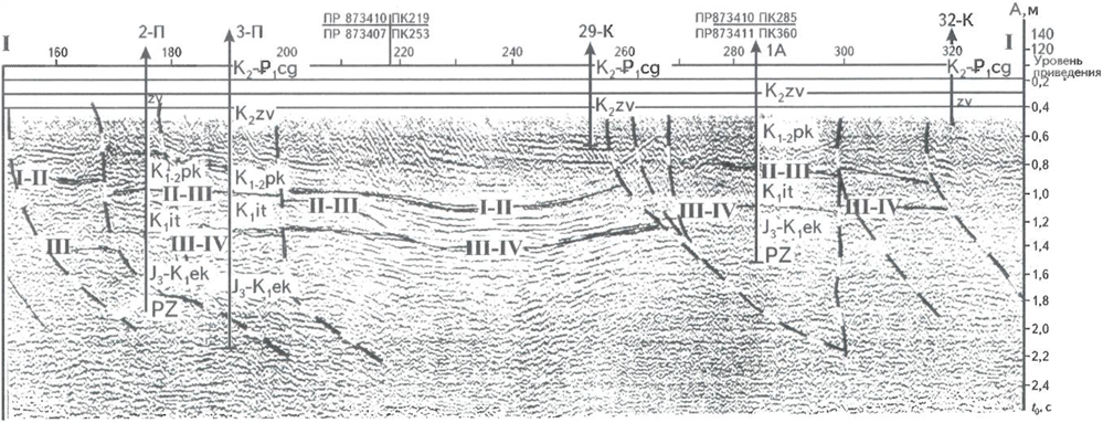 1 - разрывные нарушения; 2- отражающие горизонты; 3-скважины; 4 - пересечения сейсмопрофилей, их номера и номера пикетов; положение профиля см. на рис. 1
