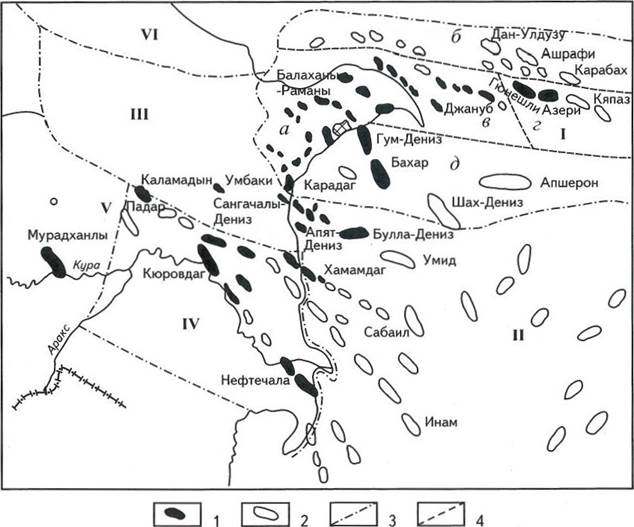 Нефтегазоносные районы: I - Апшеронский, зоны: а - Апшеронского полуострова, б-Северо-Апшеронская, в - Апшеронского архипелага, г- Апшеронского порога, д- Южно-Апшеронская экваториальная; II- Бакинский архипелаг; III- Шемахино-Кобыстанский; IV - Нижнекуринский; V - Евлах-Агджабединский; VI - Прикаспийско-Кубинский; 1 - месторождения; 2- структуры; границы: 3-НГР, 4 - зон нефтегазоносности