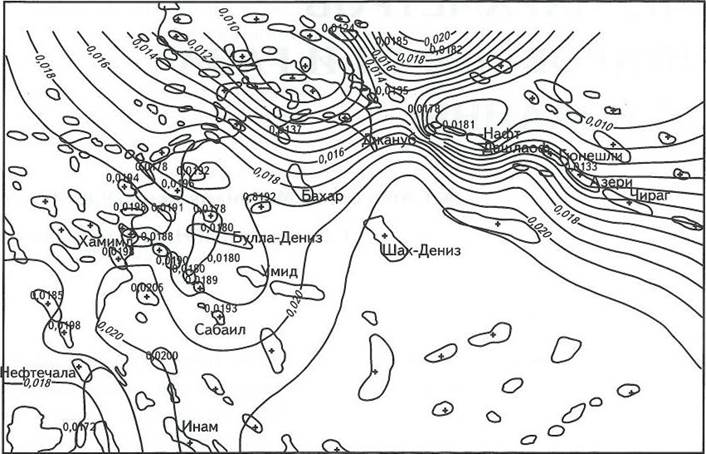 Рассмотрим в качестве примера исследований по месторождению-аналогу месторождение Бахар, которое расположено вблизи разведуемой структуры Шах-Дениз, в пределах одного антиклинального пояса (см. рис. 1).