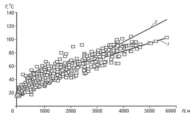 Рис. 3. ГРАФИК ЗАВИСИМОСТИ ТЕМПЕРАТУРЫ ОТ ГЛУБИНЫ ПО ОБЪЕКТАМ ЮЖНО-КАСПИЙСКОЙ ВПАДИНЫ