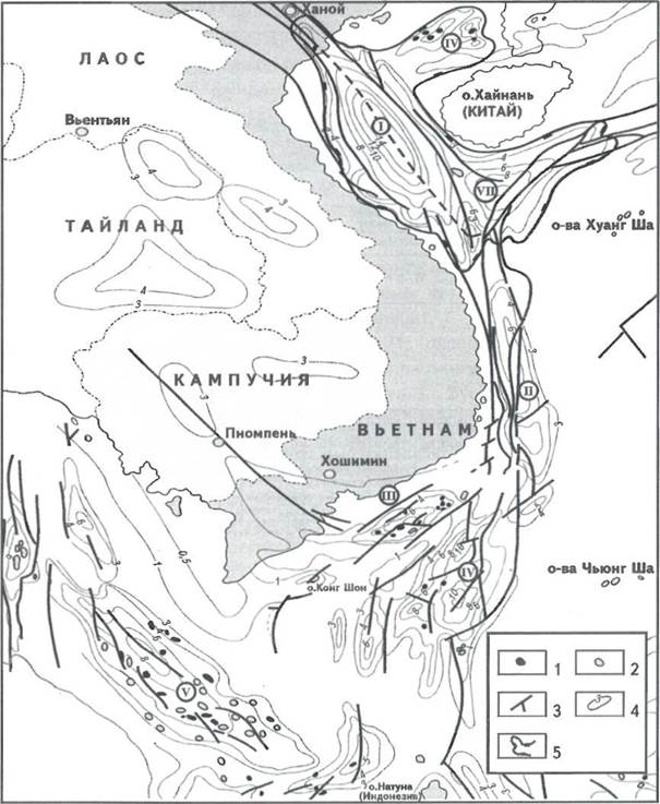 Месторождения: 1 - нефтяные, 2- газовые; 3 - тектонические нарушения; 4 - изопахиты осадочного чехла, км; 5- граница бассейнов залива Бакбо; бассейны (цифры в кружках): I- Шонг-Хонг, II-Фукханьский, III-Кыулонгский, IV- Южно-Коншонский, V-Малайский, VI-Бейбуван, VII- Южный Хайнань