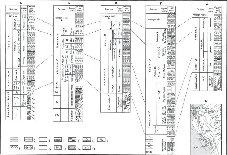 А - Ханойский прогиб. Б- впадина Бейбуван (запад), В - прогиб Шонг-Хонг (север). Г- прогиб Шонг-Хонг (дипоцентр), Д- впадина Хуэ, Е- положение литолого-стратиграфических колонок в бассейнах залива Бакбо; 1 - пески, песчаники; 2- гравелиты; 3-алевролиты; 4 - глины; 5- аргиллиты, углисто-глинистые сланцы; 6-карбонаты; 7-турбидиты; 8-конгломераты; 9-метаморфические сланцы; 10-магматические породы; 11-туфы; 12-торфяники; 13-залежи и нефтегазопроявления