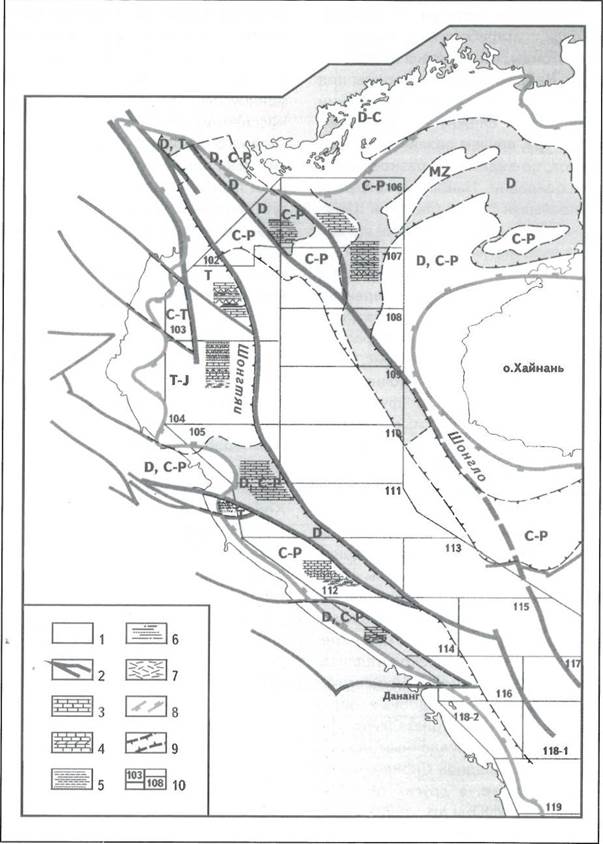 1 - протерозой-раннепалеозойский фундамент; 2 - региональные разломы; 3 - предполагаемый литолого-стратиграфический разрез “переходного комплекса”; преимущественное развитие отложений: 4 - карбонатных, 5 - терригенных, 6 - угленосных, 7 - вулканогенно-осадочных; границы: 8 -бассейнов Бакбо, 9-области развития “переходного комплекса”, 10 - лицензионных блоков