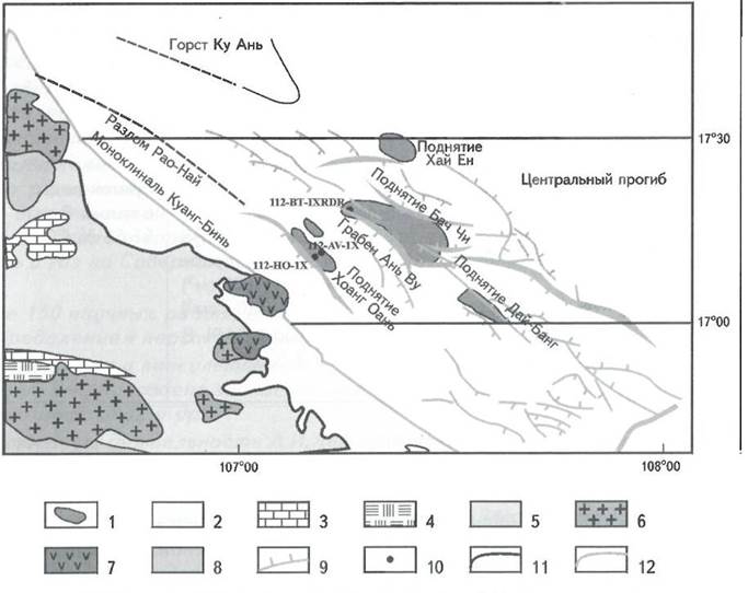 Рис. 4. СХЕМАТИЧЕСКАЯ КАРТА ЦЕНТРАЛЬНОЙ ЧАСТИ ВПАДИНЫ ХУЭ (с использованием материалов “Вьетгазпром”, “Петровьетнам”, “Шелл”)