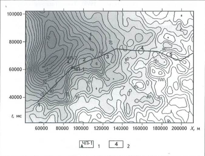 Это обстоятельство положено в основу способа, позволяющего учесть и в дальнейшем вычесть из наблюденных значений продольного сопротивления его “литологическую” составляющую, связанную прямо пропорционально со скоростью, и изучать ту его часть, которая характеризует тип флюидонасыщения и оценивается комплексным сейсмоэлектроразведочным параметром. Положительные значения комплексного сейсмоэлектроразведочного параметра, превышающие фоновые в 2-5 раз, считаются аномальными и свидетельствуют о возможном присутствии в разрезе высокоомного флюида (УВ). Совместное рассмотрение схем распределения комплексного параметра и волновой картины временного сейсмического разреза позволяет не только выявить зоны, перспективные для обнаружения залежи УВ, но и дать прогноз типа предполагаемой ловушки [2].