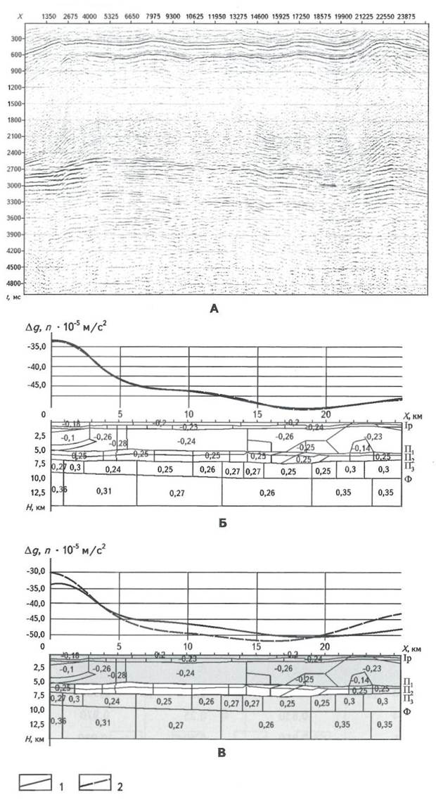 А - временной разрез, Б - согласованная плотностная ФГМ, В - гравиэффект с исключением подсолевого объекта; кривая Δg: 1 - наблюденная, 2- расчетная