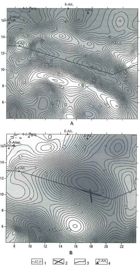 Карты: А - оптимальной остаточной составляющей, Б- фоновой компоненты (степень полинома n= 7, S(Δgocт) = 3,3 • 10-5 м/с2, в качестве Н заданы глубины по кровле соли); 1 - изолинии Δg; 2- участок аномального значения комплексного сейсмо-электроразвелочного параметра; 3 - участок аномального профиля Оренбург - Маныч; 4 - скважины