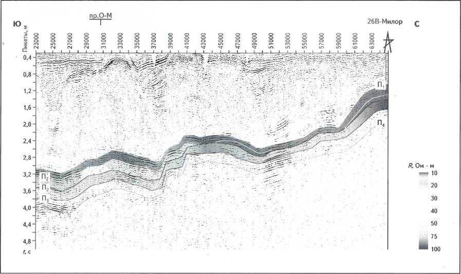 Рис. 4. РАСПРЕДЕЛЕНИЕ ПРОДОЛЬНОГО ЭЛЕКТРИЧЕСКОГО СОПРОТИВЛЕНИЯ ДЛЯ ПОДСОЛЕВОГО КОМПЛЕКСА ОТЛОЖЕНИЙ ПО ДАННЫМ МТЗ (профиль 5э, Алтатинско-Никольская зона)