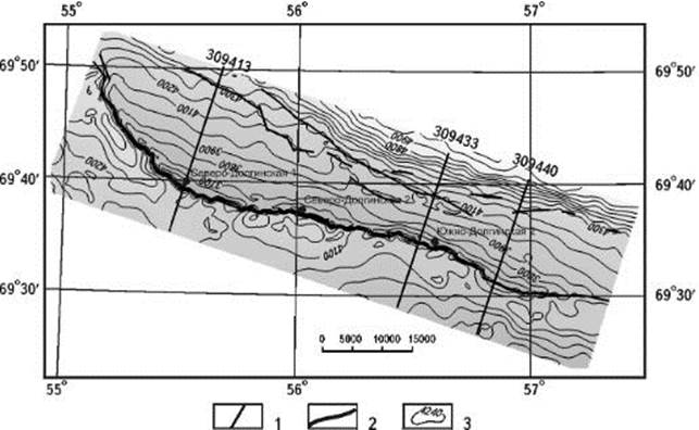 1 - геологические разрезы; 2 - разломы; 3 - изогипсы отражающего горизонта