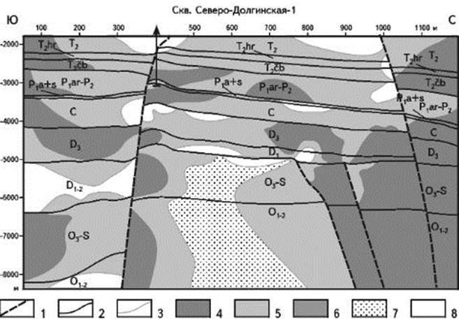 Рассмотрим более детально распределение полей напряжений в районе скв. Северо-Долгинская-1. Верхняя часть, приходящаяся на висячее крыло главного Долгинского сбрососдвига, находится в ненагруженном состоянии. После пересечения разлома и до границы триас - пермь скв. Северо-Долгинская-1 проходит через сильнонагруженный участок. В пермских отложениях до отражающего горизонта l21u (P2u) располагается участок со средними значениями поля напряжения, который переходит в область концентратора, протягивающуюся до границы la (P1a+s). В блоке каменноугольного возраста картина распределения напряжений аналогичная, т.е. в верхней части блока - область пониженных значений, в нижней - повышенных.