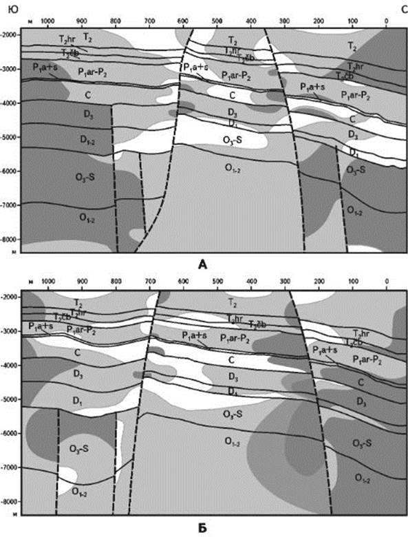 Моделирование напряженного состояния Долгинской структуры было выполнено на вертикальных разрезах. Эксперименты проводились на нескольких моделях, имитирующих структурированные вертикальные срезы-сечения северо-восточного простирания через Долгинскую структуру (рис. 1). В качестве границ основных элементов модели были выбраны главные разрывные нарушения, выделенные по сейсмическим данным и поверхности напластования стратиграфических систем: ордовик-силурийской, девонской, каменноугольной, пермской и триасовой. Геоинформационные технологии позволили осуществить строгую привязку в единой системе координат - модельные образцы и реальные геологические профили, что дало возможность совместить на общих разрезах структурно-геологическую и экспериментальную информацию.