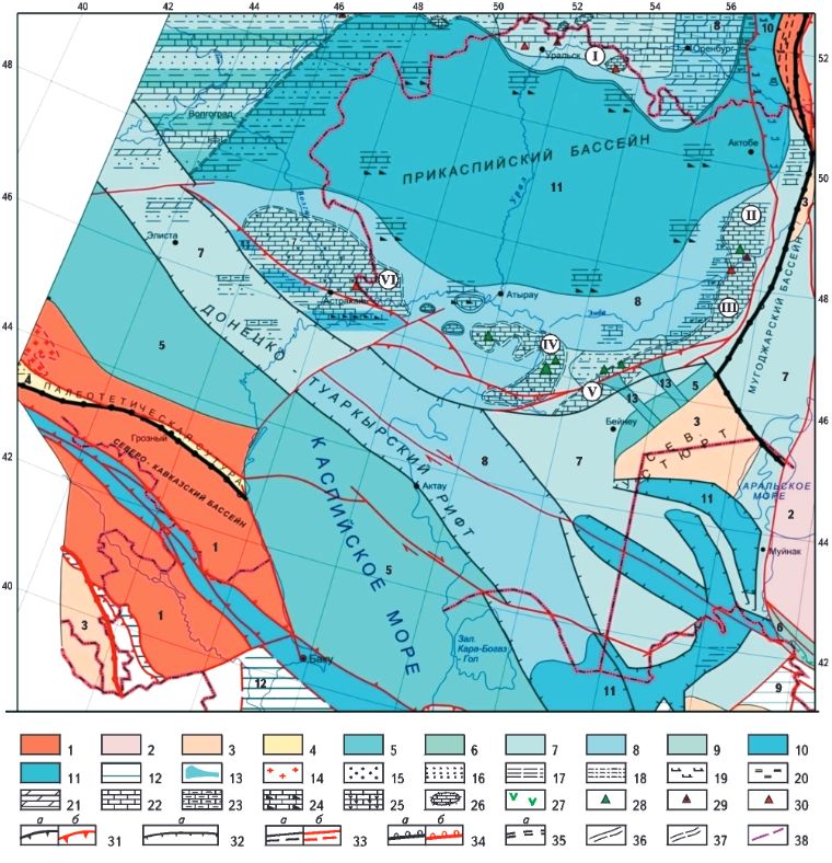Палеогеографические обстановки: 1 - низкие горы; 2 - возвышенности; равнины: 3- возвышенные денудационные, 4 - низменные озерно-аллювиальные, 5 - прибрежные; 6 - контрастный рельеф зрелых островных дуг; шельф: 7 - внутренний, 8 - внешний, 9- нерасчлененный, 10- континентальный склон, подножие, 11 - глубоководные впадины внутриконтинентальных и окраинных морей, 12- отсутствие информации в результате позднейшей деструкции, 13- подводные конусы выноса; коллизионные пояса: 14- граниты; осадочные комплексы: 15-конгломераты, 16- пески, песчаники, 17-аргиллиты, глины, 18- суглинки, 19- турбидиты и флиш, 20- фтаниты, 21 - доломиты, 22- известняки, 23- глинистые известняки, мергели, 24- битуминозные известняки, 25- биогенные известняки, 26- карбонатные постройки (рифы, биостромы); вулканические пояса: 27- лавы и туфы известково-щелочного состава; месторождения: 28- нефтяные, 29- нефтегазовые, 30- газовые; разрывные нарушения (а - конседиментационные, б - постседиментационные): 31 - надвиги, 32- сбросы (тектонические швы), 33 - разломы неизвестной природы, 34- главные коллизионные сутуры, 35- интенсивная складчатость; границы: 36- палеогеографических обстановок (установленные, предполагаемые), 37- карбонатных платформ, 38- распространения кунгурских соленосных отложений; изолированные внутрибассейновые карбонатные платформы: I- Карачаганакская, II- Темирская, III - Жанажольская, IV - Тенгиз-Кашаганская, V - Южно-Эмбинская, VI - Астраханская