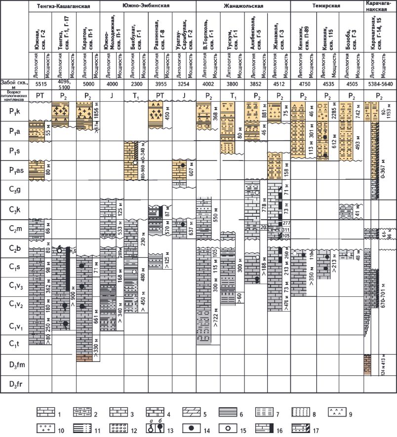 В пределах Темирского карбонатного массива на восточном борту Прикаспийской впадины в поисковых скв. Г-1-Бактыгарын (5059 м), Г-8-Северная Бозоба (5008 м) и Г-4-Кумсай (4833 м) впервые вскрыты карбонатные отложения девона. Эти отложения со стратиграфическим несогласием перекрываются карбонатными отложениями поздневизейского возраста. Из разреза выпадают терригенные отложения средне-ранневизейского возраста, которые широко развиты южнее месторождения Кенкияк, где их вскрытая толщина составляет около 2000 м.