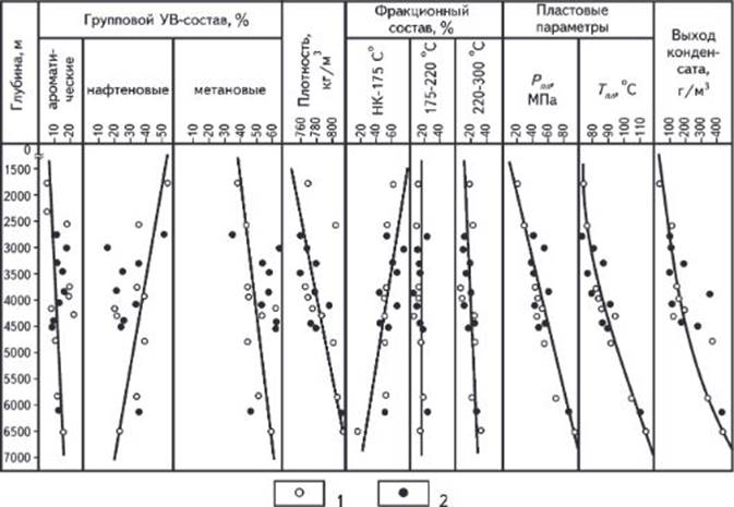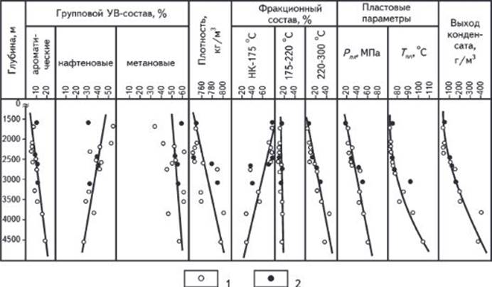 изменение физико-химических свойств конденсатов с глубиной зависит от химической природы жидкой фазы УВ-систем в залежах; с ростом глубины и, в этой связи, термобарических параметров залежей в групповом УВ-составе конденсатов увеличивается содержание метановых и ароматических УВ, ввиду их лучшей растворимости в газовой фазе, достигая в сумме 75-80 % на глубине 5000 м.