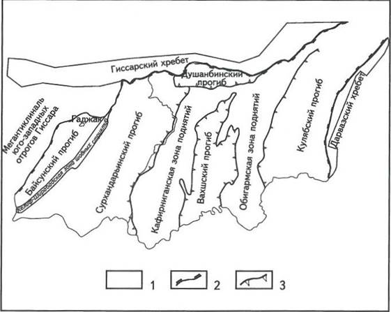 1 - выходы на поверхность палеозойских образований; граница: 2 - впадины, 3 - тектонических элементов Афгано- Таджикской впадины