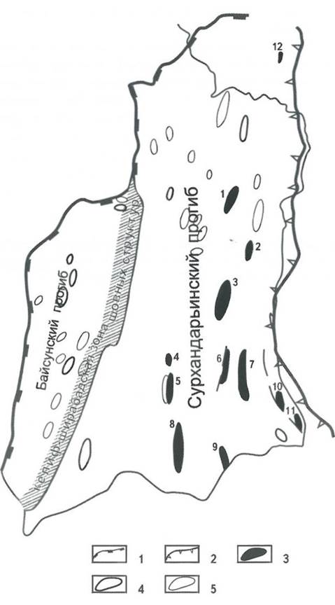 А - Сурханларьинский мегапрогиб: граница: 1 - Афгано-Таджикской впадины, 2 - тектонических элементов; 3 - нефтяные месторождения: 1 - Миршады, 2- Коштар, 3- Дяльми- кар, 4 - Джалаир, 5- Хаудаг, 6 - Кокайты, 7- Актау, 8-Учкызыл, 9-Джейранхона, 10-Корсаглы, 11 - Амударья, 12- Южная Курганча; структуры: 4 - выявленные, 5- предполагаемые; Б - Вахшский прогиб: 1 - контуры структур; 2 - флексурно-разрывные зоны; 3 - взбросы и взбросонадвиги; 4 - прочие разрывные нарушения; 5- зона нефтегазонакопления; 6 - граница Вахшского прогиба; 7- скважины: а - параметрические, б - поисковые, в - разведочные; месторождения: 1 - Кызыл-Тумшук, 2 - Акбаш-Адыр, 3 - Кичик-Бель; В- Кулябский мегапрогиб: 1 - контуры структур; .2- взбросы и взбросонадвиги; 3- прочие разрывные нарушения; граница: 4 - Кулябского прогиба, 5 - Афгано-Таджикской впадины; 6-зона нефтегазонакопления; 7-скважины: а-параметрические, б - поисковые, в - разведочные; месторождения: 1 - Бештентяк, 2 - Сульдузы, 3 - Южный Пушион, 4 - Ходжасартис, 5 - Узунохор