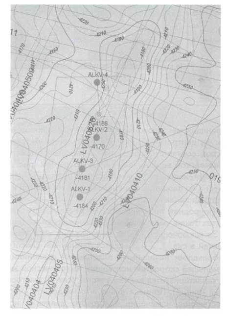 Проблема и цель исследования. В качестве рабочей модели геологического строения Алексеевского месторождения принята пликативная модель, в соответствии с которой Алексеевская антиклинальная складка, осложненная тремя вершинами, по турнейским отложениям вытянута в северо-северо-восточном направлении вдоль седиментационного уступа (рис. 1). Однако результаты начавшейся с конца 2001 г. пробной разработки залежей в бобриковских и турнейских отложениях свидетельствуют о возможности формирования разломно-блоковой модели строения месторождения. В частности, в пределах четырех скважин, расположенных на относительно близком расстоянии (600, 800 и 1200 м соответственно между скв. 1, 3, 2 и 4), установлено значительное несовпадение уровней ВНК для всех залежей (7 м между скв. 2 и 4, 13 м между скв. 1 и 3). Исключение составляет только участок расположения скв. 2 и 3, где уровень ВНК одинаковый для каждой из залежей.