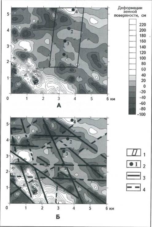 При геологической интерпретации полученных неотектонических деформаций земной поверхности использованы традиционные критерии: а - линейно вытянутые и протяженные зоны отрицательных значений неотектонических деформаций земной поверхности интерпретируются как зоны неотектонически активных разрывных нарушений (зоны повышенной трещиноватости) или их участков (зоны разуплотнения и “проседания” земной поверхности); б - локализованные области развития положительных по знаку деформаций земной поверхности интерпретируются как активные локальные поднятия (зона поднятий) или их отдельные блоки, испытывающие новейший рост (восходящие неотектонические движения).