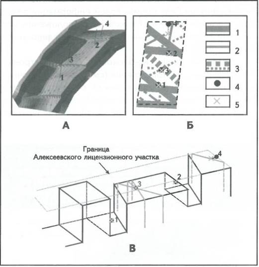 А - с учетом разного уровня ВНК по скв. 1, 2, 3 и 4, Б-с учетом особенностей напряженно-деформационного состояния земных недр; прогнозируемые зоны повышенной трещиноватости разной ширины: 1 - 300-700 м, 2- 200-300 м и степени неотектонической активности: 1, 2- активные, 3- менее активные; 4 - устье скважины; 5 - забой скважины, В - прогнозируемая модель геометрии продуктивных горизонтов